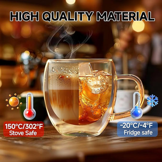 Set of 4 Double Walled Glass Coffee Mugs 8 Ounces Insulated Layer Coffee Cups with Handle Borosilicate Glass Espresso Cup for Hot Beverage,Cappuccino,Tea,Latte,Wine,Microwave Safe