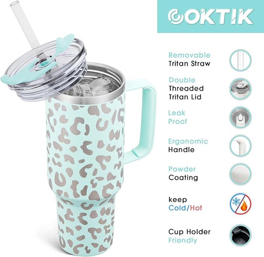 COKTIK 40 oz Tumbler With Handle and Straw Lid, Vacuum Insulated Travel Coffee Mug Stainless Steel Insulated Cup for Beverages, Leak-proof, Cupholder Friendly (Seafoam Leopard)