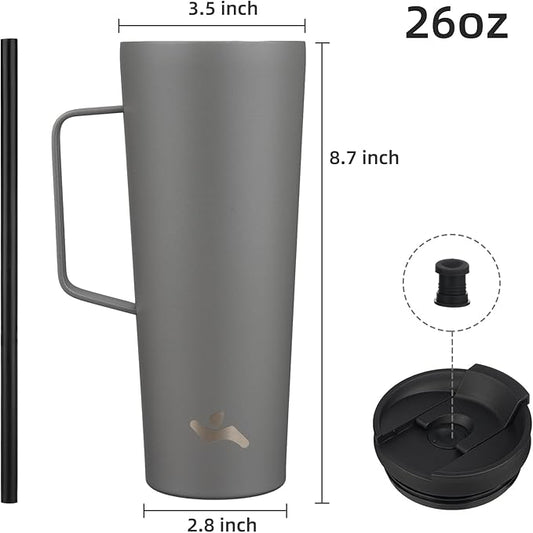 Insulated Tumbler with Handle and Straw, 26 OZ Travel Coffee Mug Stainless Steel Cup Metal Water Bottle,Grey