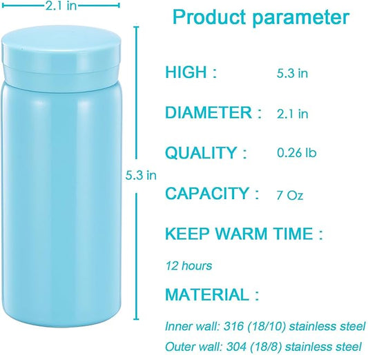 Mini Thermos Cute Water Bottle - 7 oz Tiny Insulated Vacuum 18/10 Stainless Steel Small Flask - Leak Proof & Spill Proof & Keeps Cold and Hot for Drink, Coffee, Tea - Light Blue