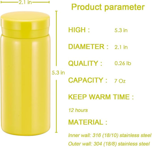 Mini Thermos Cute Water Bottle - 7 oz Tiny Insulated Vacuum 18/10 Stainless Steel Small Flask - Leak Proof & Spill Proof & Keeps Cold and Hot for Drink, Coffee, Tea - Yellow