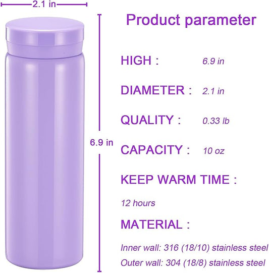 10oz Mini Water Bottle Stainless Steel Thermos Small Flask - Insulated Vacuum, Leak Proof, Keeps Drinks Hot/Cold - Ideal for Coffee, Tea, Water - Purple