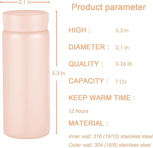 Mini Thermos Cute Water Bottle - 7 oz Tiny Insulated Vacuum 18/10 Stainless Steel Small Flask - Leak Proof & Spill Proof & Keeps Cold and Hot for Drink, Coffee, Tea - Pink