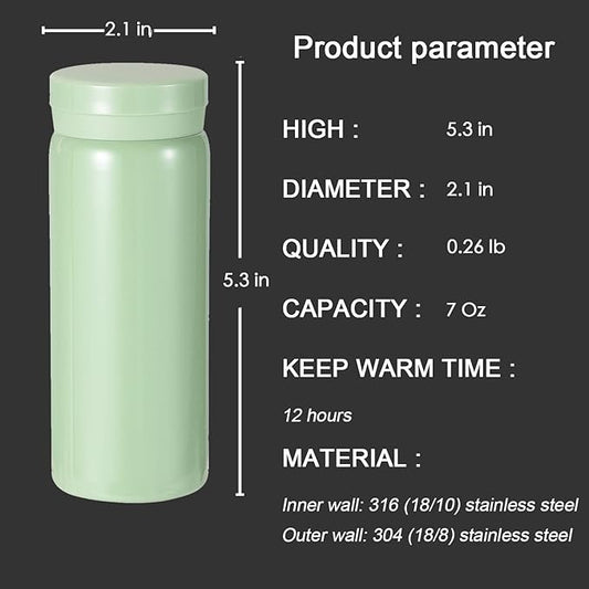 Mini Thermos Cute Water Bottle - 7 oz Tiny Insulated Vacuum 18/10 Stainless Steel Small Flask - Leak Proof & Spill Proof & Keeps Cold and Hot for Drink, Coffee, Tea - Light Green