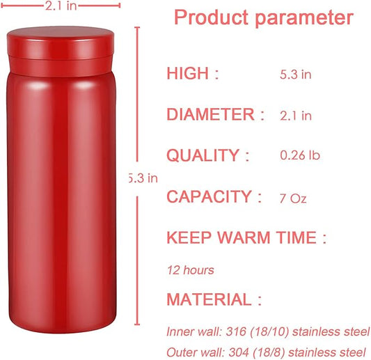 Mini Thermos Cute Water Bottle - 7 oz Tiny Insulated Vacuum 18/10 Stainless Steel Small Flask - Leak Proof & Spill Proof & Keeps Cold and Hot for Drink, Coffee, Tea - Red