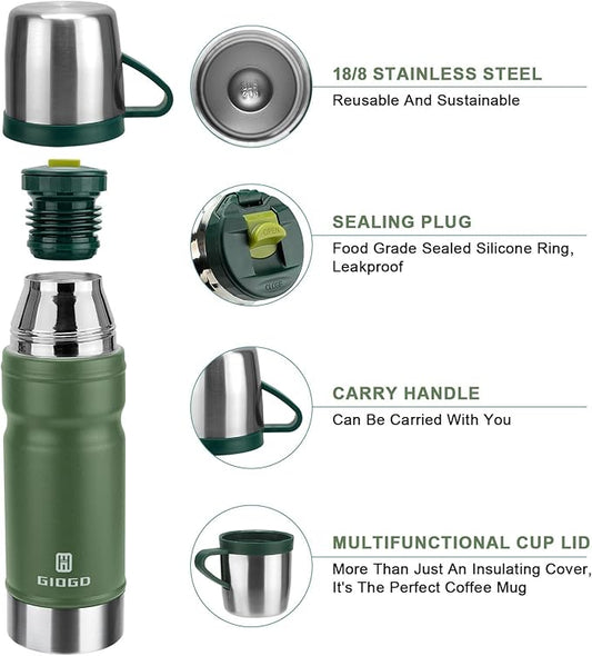 Insulated Vacuum Thermo Bottle 750ml/25.4oz with Cup Stainless Steel Coffee Bottles for Hot and Cold Drink Water Flask.(Green, with Handle, 750ml)