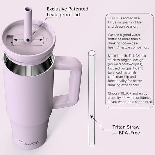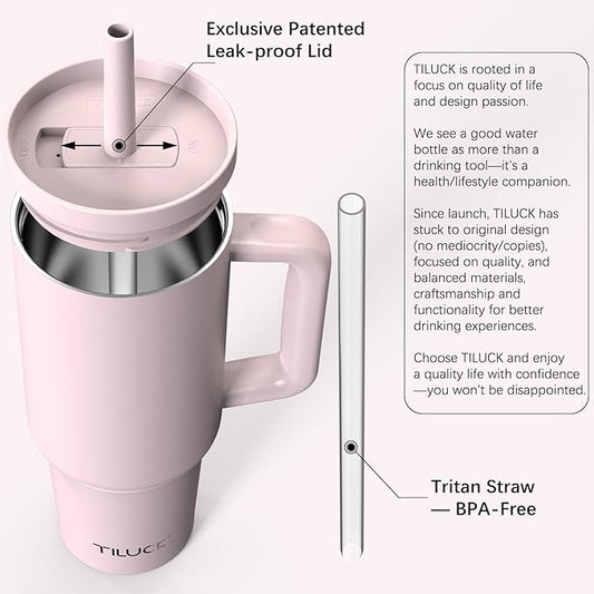 TILUCK 40 oz Tumbler with Handle, Vacuum Insulated Stainless Steel Travel Mug with 100% Leak-Proof Silicone Straw Lid, Cupholder Friendly Water Bottle(LightPink, 40oz)
