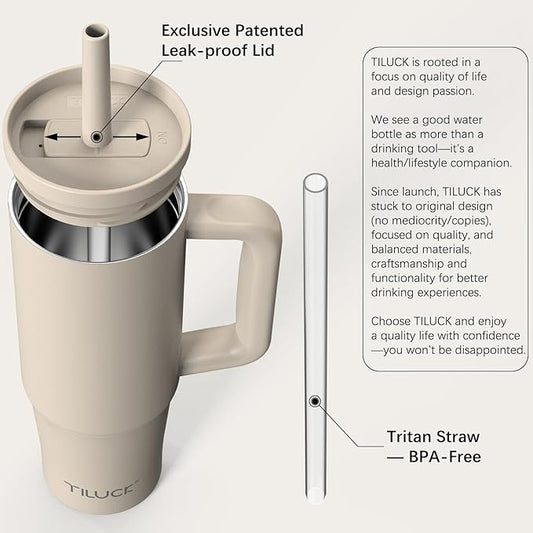TILUCK 40 oz Tumbler with Handle, Vacuum Insulated Stainless Steel Travel Mug with 100% Leak-Proof Silicone Straw Lid, Cupholder Friendly Water Bottle(MistyGray, 40oz)