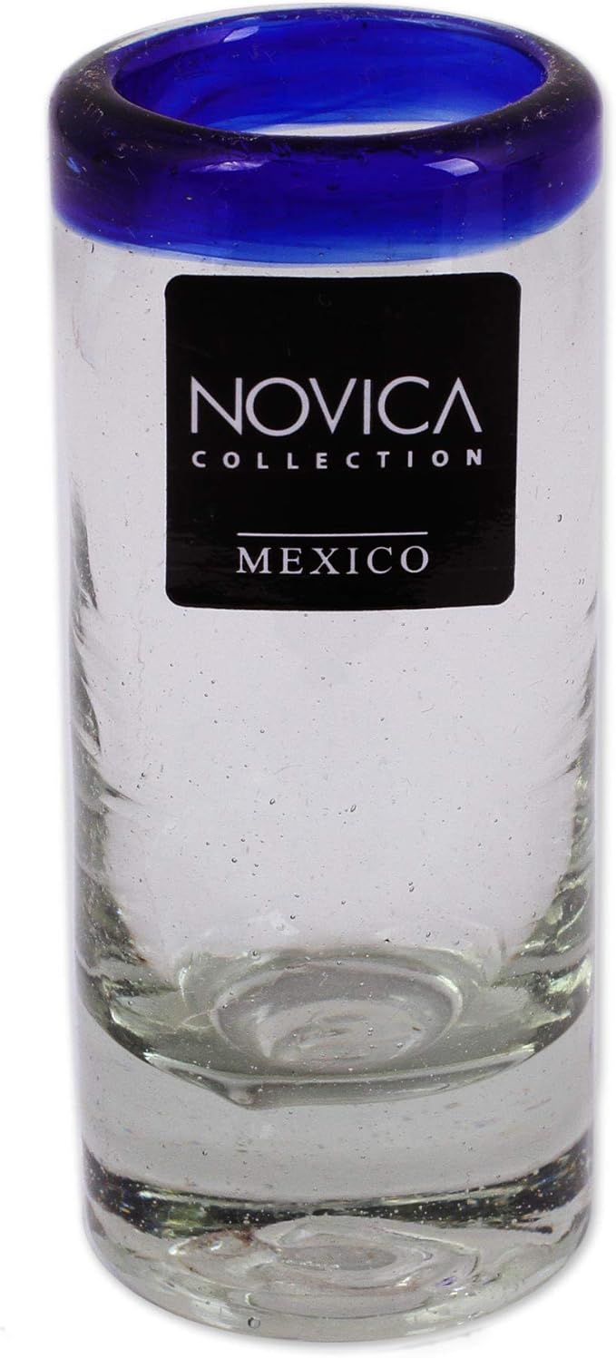 NOVICA Artisan Crafted Hand Blown Clear Blue Rim Recycled Glass Shot Glasses, 2 Oz. 'Tequila Blues' (Set Of 6)