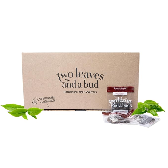 Two Leaves and a Bud Organic Assam Black Tea Bags, Whole Leaf Caffeinated Assam Tea in Compostable Sachets, Delicious Plain or with Milk, 100 Count (Pack of 1)