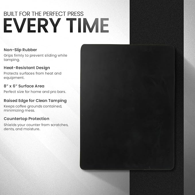 - CLEANER WORKSPACE: Keep coffee grounds at bay with this espresso tamping mat's firm surface and raised edges. Say goodbye to messy countertops as it protects from portafilter spouts and spills, making cleanup easier than ever before.