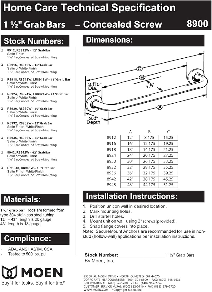 - PEACE-OF-MIND: Moen safety grab bars for walls are designed for hassle-free installation
