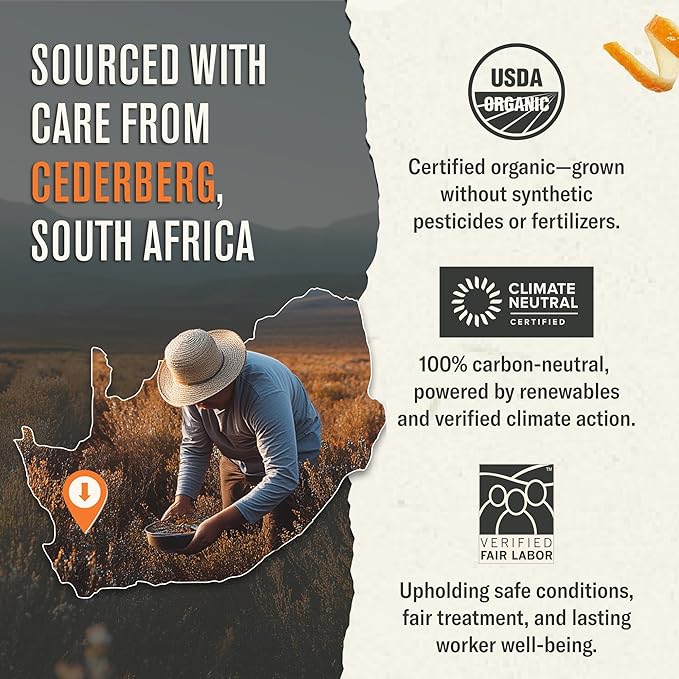 - Rooibos Tea: Also called Red Tea, Rooibos is an herb indigenous to the Cederberg region of South Africa; It has a deep, earthy vanilla taste, is rich in antioxidants and known for its calming affects