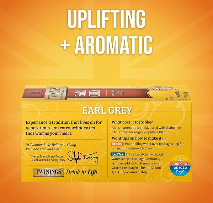 - CLASSIC BLACK TEA: Fresh, fragrant and flavoured with distinctive notes of citrus and bergamot, this Earl Grey tea has all the taste of the original; Caffeinated, 25 Count, Pack of 6