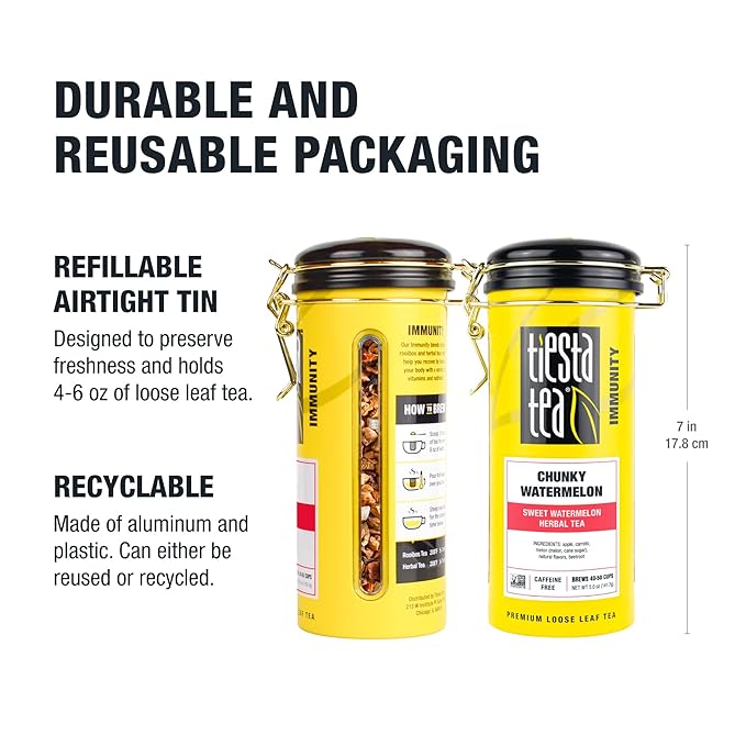- REUSABLE TEA TIN FOR TEA LOVERS: Our charming and reusable tin is the perfect gift for tea enthusiasts. Offering airtight storage, it ensures that your watermelon loose leaf tea remains cozy and fresh for 40-50 cups. Not only a functional addition to your tea collection, but it also sits beautifully on your countertop, a testament to your passion for fine teas.