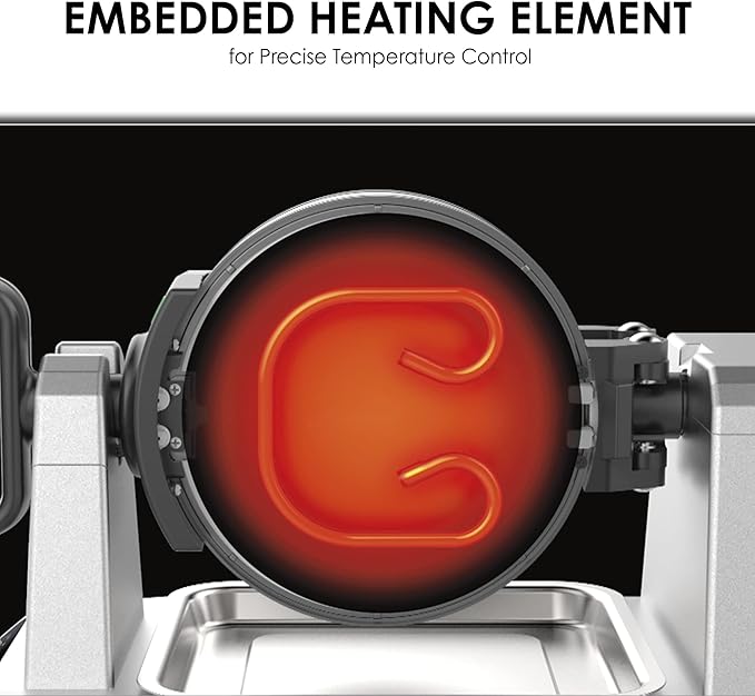 - Heating elements are embedded into plates for precise temperature control and even heat distribution, for a consistent golden-brown result
