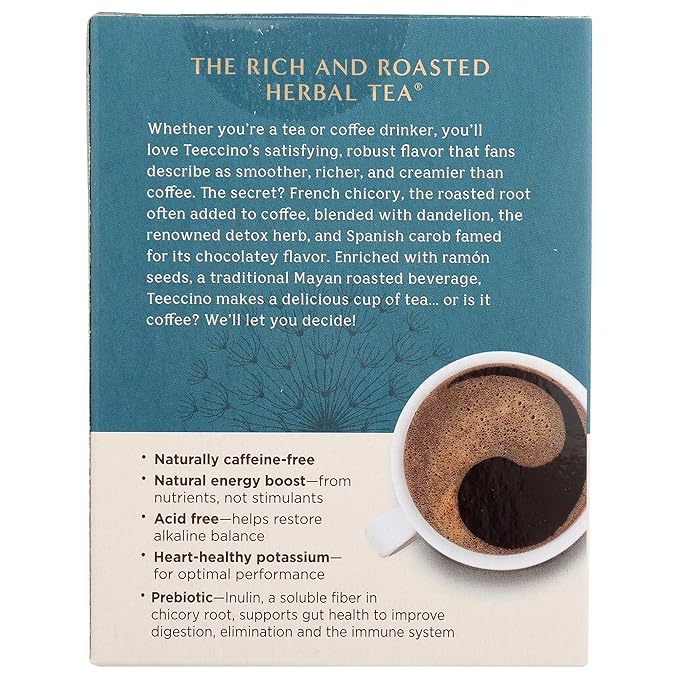 - 3X MORE HERBS - Teeccino’s 6g tea bag holds three times more herbs than standard tea bags which increases its benefits for maximum wellness in your cup. No artificial flavors, chemicals, MSG, or preservatives. Non-GMO, organic herbs.