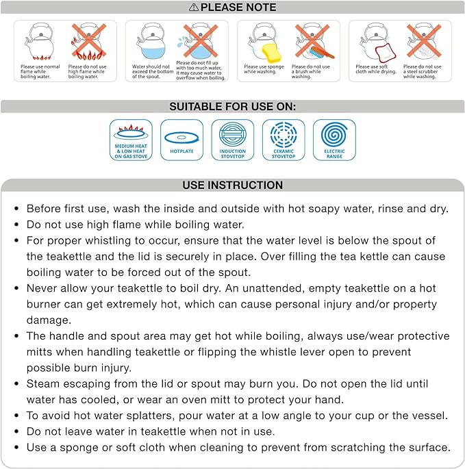 - One of its unique features is the pleasant sounds it emits while boiling water. It produces a gentle harmonica melody at low boil and a car horn whistling sound when the water reaches boiling point, alerting you that your water is ready for brewing your favorite hot beverages. This adds a delightful touch to the tea-making process, making it an enjoyable experience.
