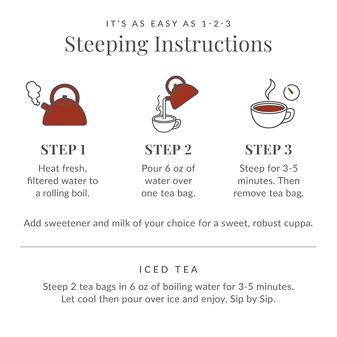 - Steeping black tea is easy. Simply heat fresh, filtered water to a rolling boil. Then pour 6 oz water over one tea bag and steep for 3-5 minutes. Add a splash of milk of choice, if desired. Enjoy hot or iced