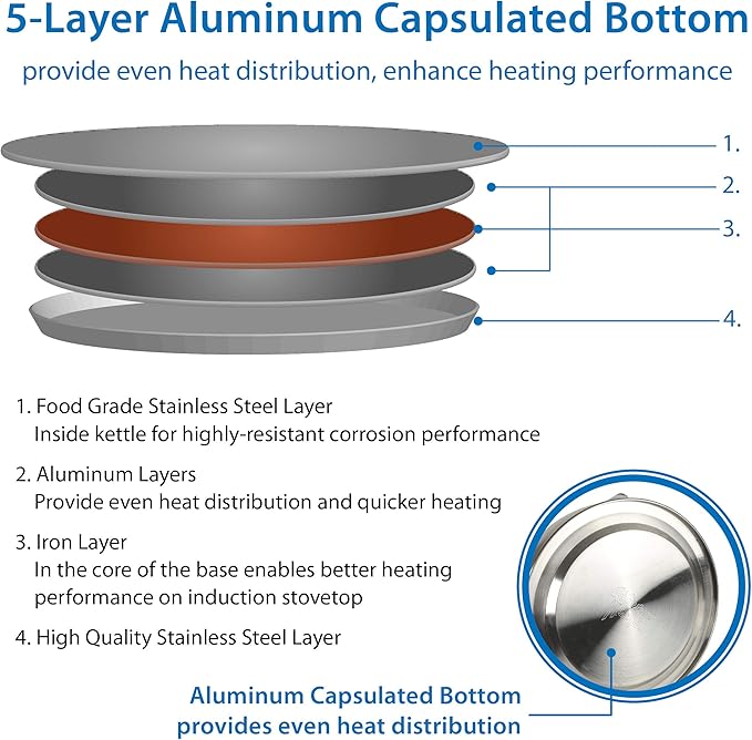 - 5-Layer Encapsulated Base: Engineered with a 5-layer bottom of stainless steel, aluminum, and iron, this base delivers rapid and uniform heat. Compatible with all stovetops including gas, induction, electric, and ceramic. It brings water to a boil faster, allowing you to enjoy your favorite drinks with minimal waiting