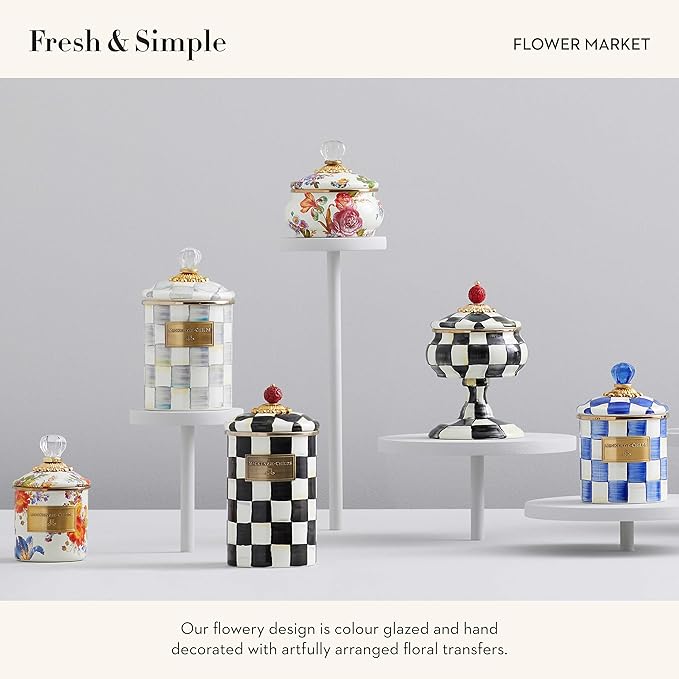 - UNIQUE ENAMEL CANISTER: Fill a MacKenzie-Childs Enamel Squashed Pot with flour, tea, candy, or other contents! This lidded storage solution works as a cute sugar bowl, flour container, spice jar, or decorative holder for office supplies.