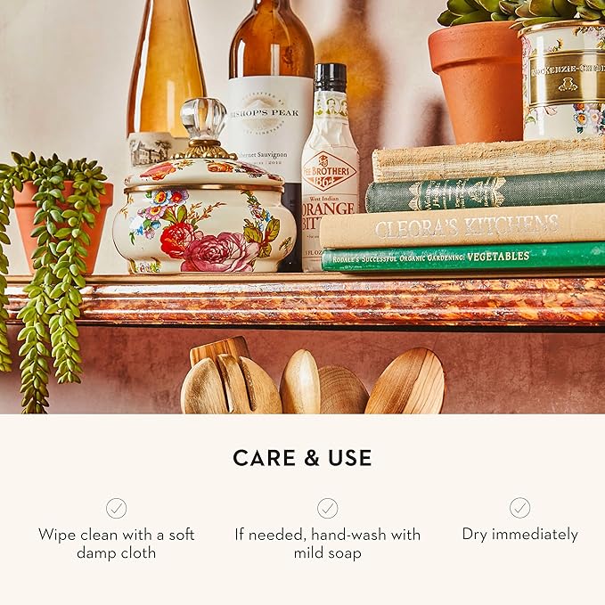 - ELEGANT STORAGE ESSENTIAL: Our Flower Market Enamel Squashed Pot offers a chubby silhouette and holds 20 oz. It features a heavy-gauge steel underbody decorated with hand-applied floral transfers, a bronzed stainless-steel rim, and a glass knob.