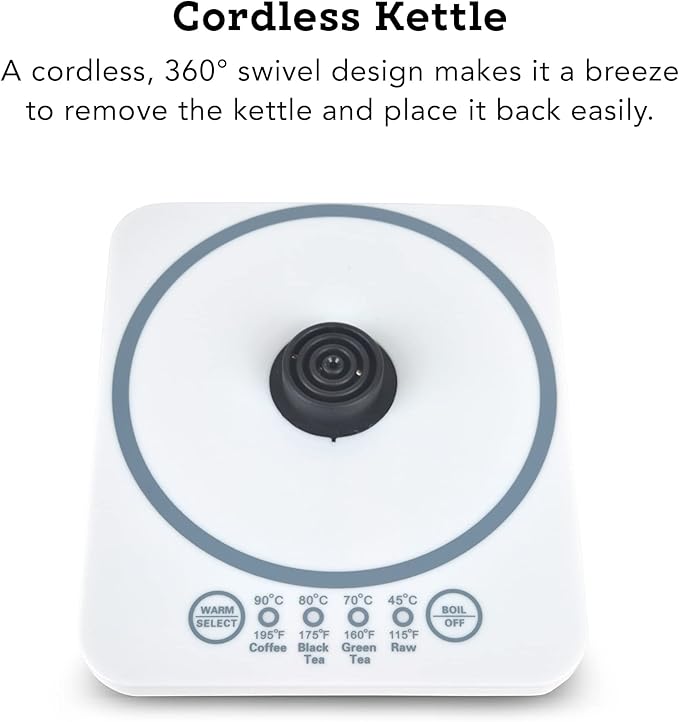 - Convenient Presets: Precise, versatile temperature controls allow you to program the kettle to your specific needs: boil, warm, coffee, black tea, green tea, and raw temperature settings