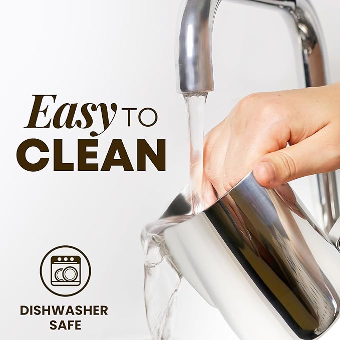 - EASY TO CLEAN: Clean this espresso milk frothing pitcher by running it under hot water with a little soap to get rid of any milk residue. Even after multiple washes, our milk pitcher for espresso machine will look as good as new and ready to add an artistic touch to your coffee. Get this stainless steel milk frothing pitcher for your friends or take it with you on trips to easily create delicious coffee drinks.