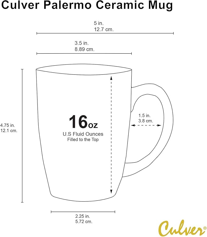 - US Fluid Ounce Volume: These mugs hold 16 US Fluid Ounces Filled to the Top