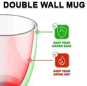 - Product Specs: Set of 2 double wall mugs measuring 9 cm opening and 11 cm height, holding 12 oz each