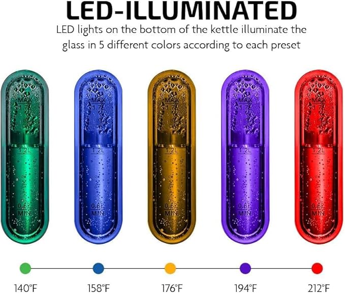 - 5 PRESET SETTINGS – Extract the richest taste and fullest flavors from every coffee bean and tea leaf with ease! Simply press the temperature settings button to select the perfect temperature for your beverage, ranging from 140°F, 158°F, 176°F, 194°F up to 212°F. The LED lights at the bottom illuminate in 5 different colors to indicate each preset temperature.