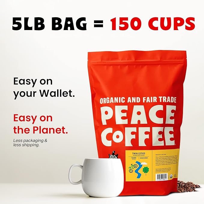 Peace Coffee Twin Cities Blend | 5 lb Ground Dark Roast | Organic Fair Trade | Smooth, Inviting Flavor | Shade Grown, Fresh Roasted