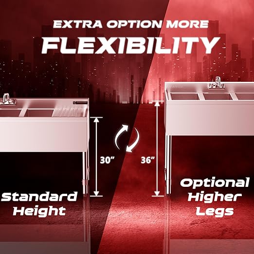 - Stability Features: Special secure leg support system with adjustable feet ensures wobble-free performance on uneven surfaces. Free standing stainless steel utility sink maintains stability during heavy commercial kitchen use. Dimension: 48 x 19 x 33