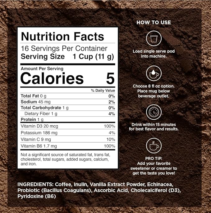 VitaCup Immunity Coffee Pods, Wellness Boost with Antioxidants, Echinacea, Probiotics, Vitamin C & D3, Medium Dark Roast, Recyclable Single Serve Pod Compatible with Keurig K-Cup Brewers,16 Ct