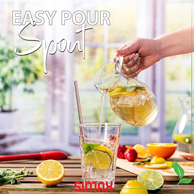 - A PITCHER WITH PRESENTATION: Thin walled for added elegance, yet with the strength of borosilicate, this small glass juice pitcher gives you the visual appeal of expensive glassware with the added durability necessary for daily use… the best of both worlds!