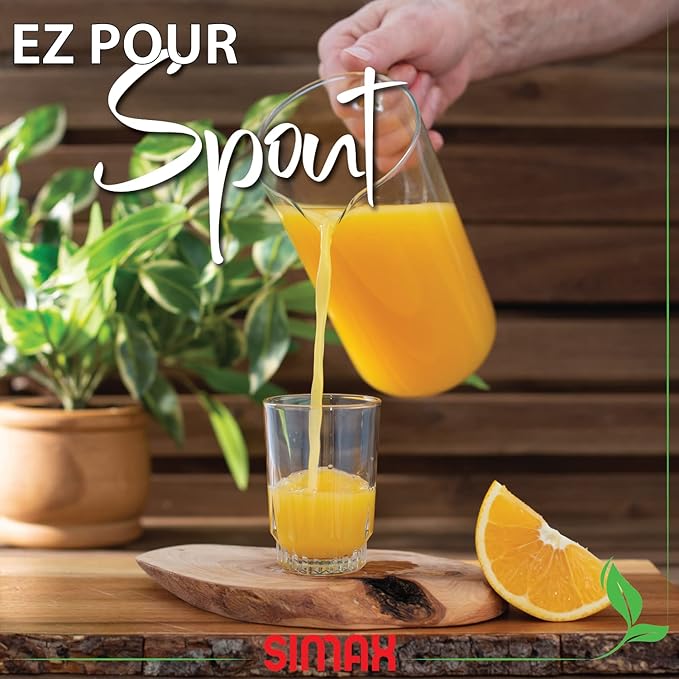 - EASY POUR SPOUT AND LARGE COMFORTABLE HANDLE make using this pitcher a breeze. Just pour and enjoy, without worrying about achy hands or cleaning up a drippy mess. Plus, Borosilicate is lighter than traditional glass, so even a full pitcher is easy to handle. Fill this beauty with your favorite beverage and enjoy the simple pleasures of life!