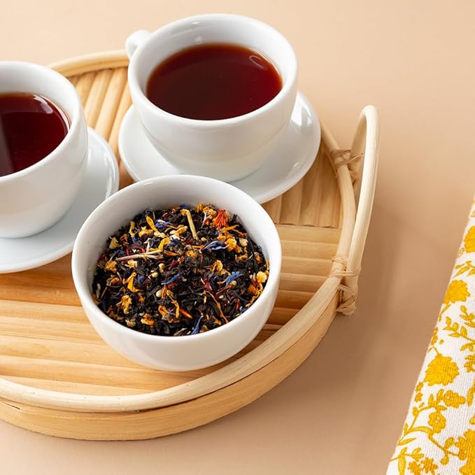 - INGREDIENTS - organic black tea, organic hibiscus petals, organic orange peel, organic raspberry leaves, organic marigolds, organic safflowers, organic cornflowers with raspberry, passion fruit and vanilla flavors