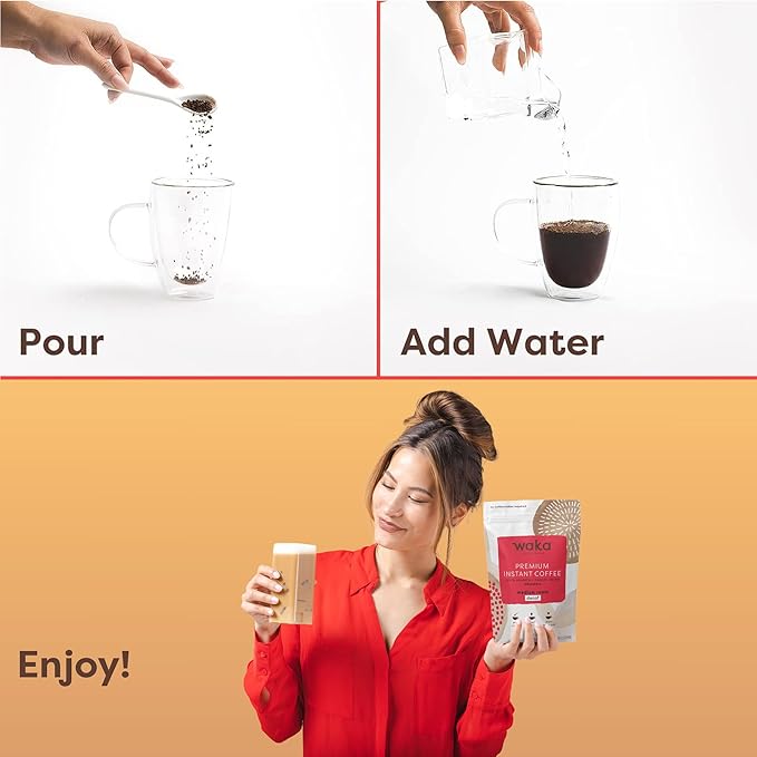 - Convenient and Affordable: At Waka, we know instant beverages the best, because it is all we do. Designed for home and office use, camping, and for those constantly on-the-go, delight in the ease and quickness of a coffee made with only 3 steps - pour, mix, and enjoy.