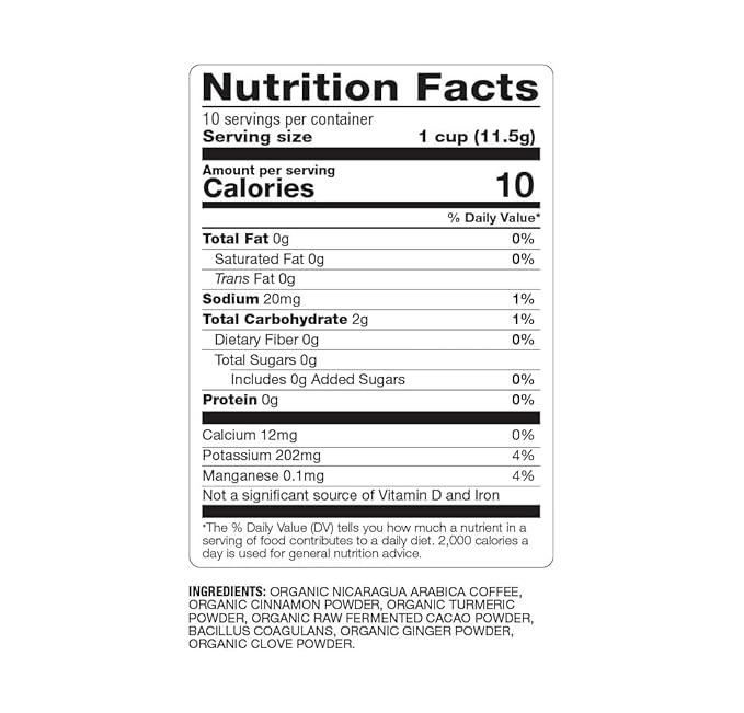 - ENERGIZING COFFEE: Crafted with organic Guatemalan Arabica beans and infused with cacao, ginger, turmeric, and cinnamon for a naturally smooth and flavorful coffee experience.
