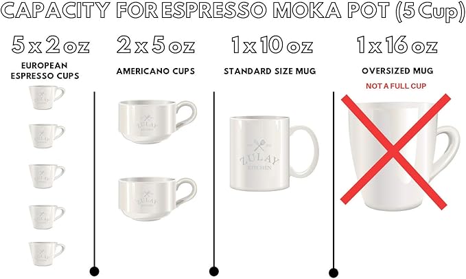 - MAKE GREAT TASTING COFFEE: Brew rich espresso the traditional way with this moka pot. Fill up the filter with your favorite coffee grounds, place the Italian coffee pot on a stovetop, and watch the best-tasting brew get ready to make rich and aromatic lattes, cappuccinos, or espresso. Brew capacity is 2, 5 oz Americano style cups or 5, 2 oz European espresso cups.