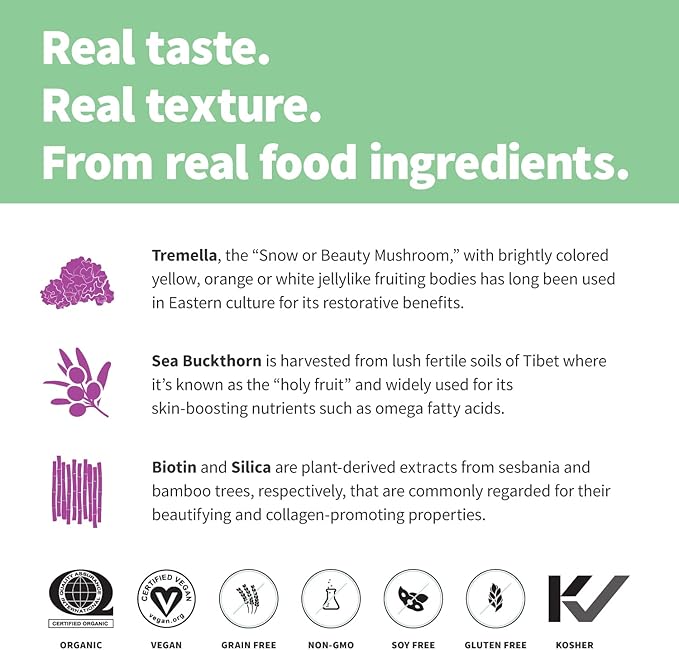 - COLLAGEN-BOOSTING SUPERFOOD PROTEIN - Organic plant protein with a superfood blend of vitamins, minerals and mushrooms designed to make you look and feel great; a bright and rejuvenating berry flavor with real raspberry, pomegranate and sea buckthorn.
