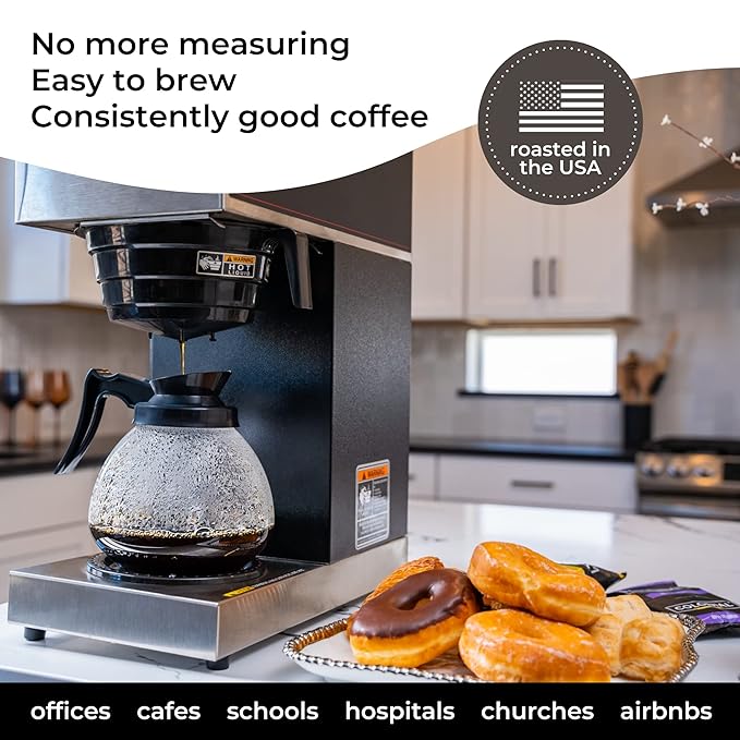 - COMMERCIAL BULK COFFEE USE – Sold in 32, 60, or 100 count box sizes. Our fresh coffee packs work with any in-house drip coffee brewing machine model and are food service friendly - works well in airpot coffee dispensers, thermal or insulated thermos dispensers. They are great for parties, offices, stores, cafes, hospitals, airbnb, hospitality supplies, motels, schools, hotels, businesses, and restaurants.