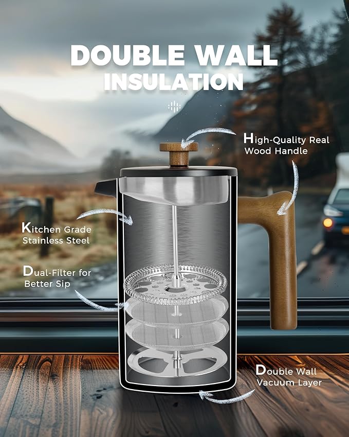 POLIVIAR French Press Coffee Maker, 34 Ounce Coffee Press with Real Wood Handle, Double Wall Insulation & Dual- Filter Screen, Food Grade Stainless Steel for Good Coffee and Tea (Vintage)