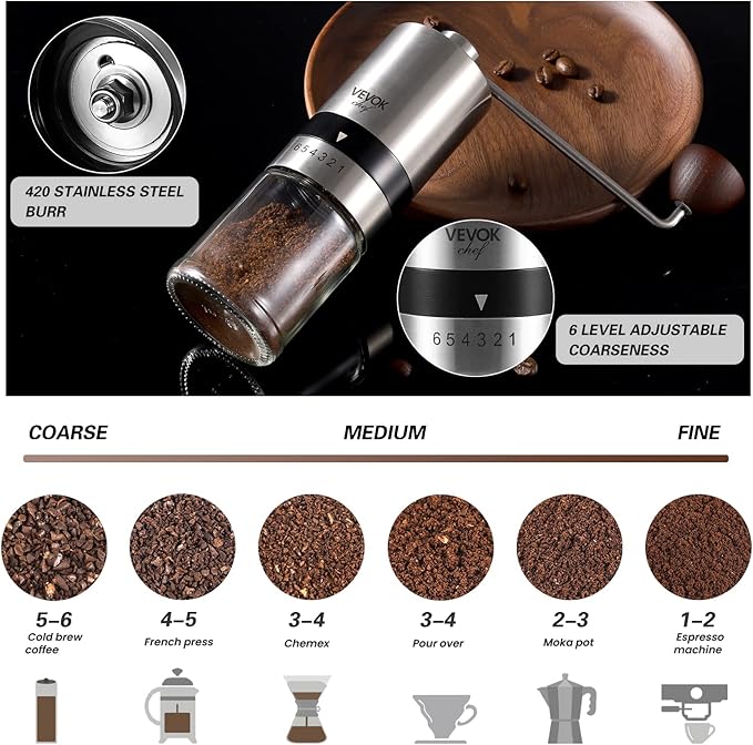 VEVOK CHEF Manual Coffee Grinder Stainless Steel Burr Grinder 6 External Adjustable Setting Vintage Hand Coffee Grinder Portable Hand Crank Conical Coffee Bean Grinder Mill for Home,Camping