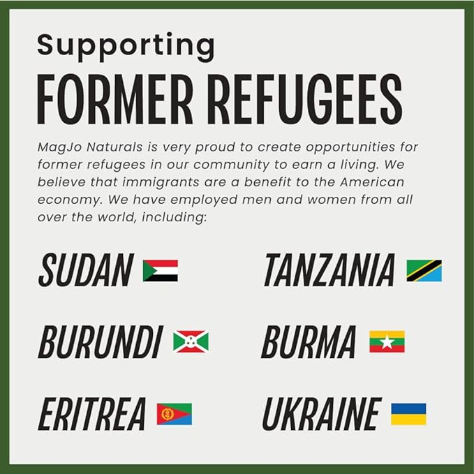 - About MagJo Naturals: We are proud employers of former refugees who are trying to restart their lives in the USA. We believe immigrants are a benefit to our nation. All of our sold products employ as many former refugees as our business can sustain.