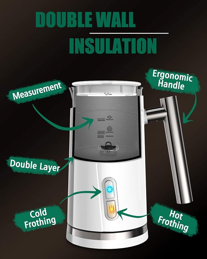 - ๐ Easy To Clean ๐ The milk frother and steamer adopt modern and fashionable design, equipped with double-layer vacuum insulation wall, high-quality stainless steel and non-stick coating interior, which can realize convenient cleaning and longevity.โค(Do not turn the milk frother upside down after cleaning).