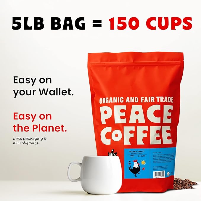 Peace Coffee French Roast | 5 lb Ground Dark Roast | Organic Fair Trade | Soft, Gentle Flavor | Shade Grown, Fresh Roasted