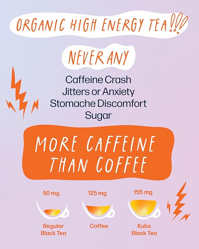 - HIGH CAFFEINE TEA BLEND: Get powerful 155mg of natural caffeine per serving - equivalent to a strong cup of coffee but smoother and longer-lasting. Our high caffeine black tea blend provides sustained alertness without the jitters or crash associated with coffee and energy drinks. Ideal coffee substitute for professionals, students, and anyone needing reliable energy throughout their busy day. The natural caffeine from organic black tea offers clean energy that keeps you focused and productive.
