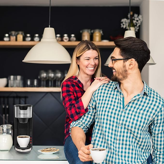 Mixpresso Black Single Serve Coffee Brewer K-Cup Pods Compatible & Ground, 30 oz Compact Coffee Maker Single Serve With 5 Brew Sizes Up To 14 Oz, Fits Travel Mug, Adjustable Drip Tray