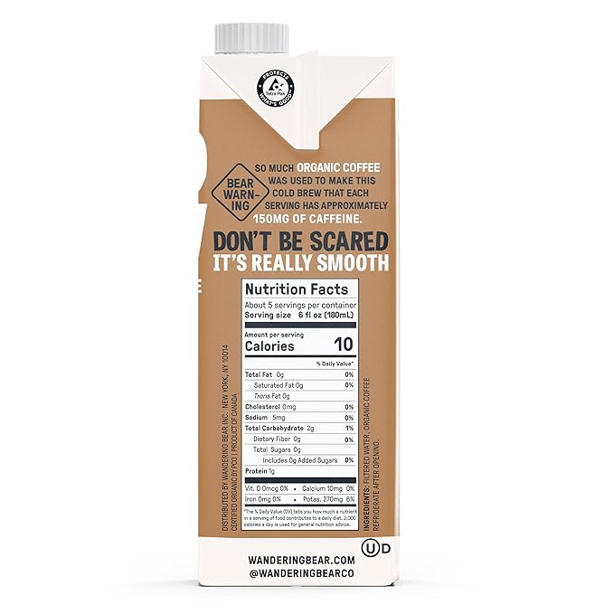 Wandering Bear Straight Black Organic Cold Brew Coffee, 32 fl oz, 6 pack - Extra Strong, Bold, Smooth, Unsweetened, Shelf-Stable, Ready to Drink, 100% Organic, Iced Cold Brewed Coffee Drinks